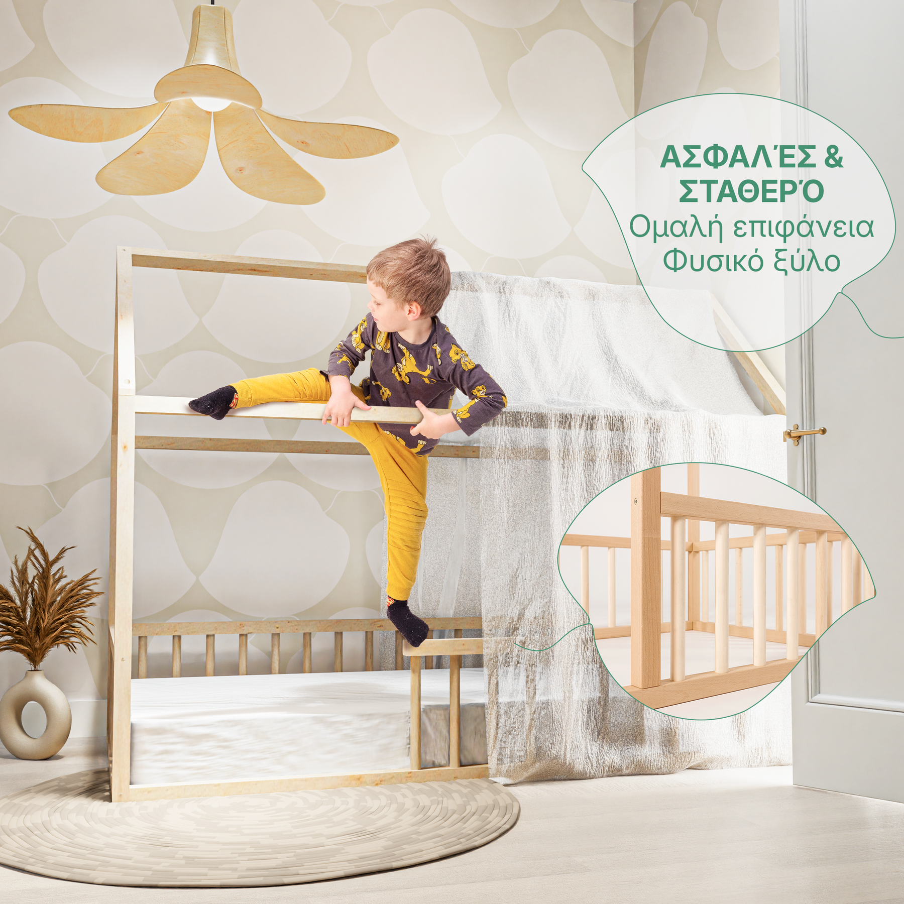 Ένα Montessori κρεβάτι δεν είναι απλώς έπιπλο — είναι ένας χώρος φροντίδας όπου το παιδί σας αισθάνεται ασφαλές και με αυτοπεποίθηση. Ο σχεδιασμός σε επίπεδο δαπέδου κάνει τη μετάβαση από την κούνια στο «μεγάλο παιδικό» κρεβάτι ομαλή και φυσική. Η προσεκτική κατασκευή και τα υλικά υψηλής ποιότητας εξασφαλίζουν ασφαλή και ξεκούραστο ύπνο και χαρούμενα πρωινά.