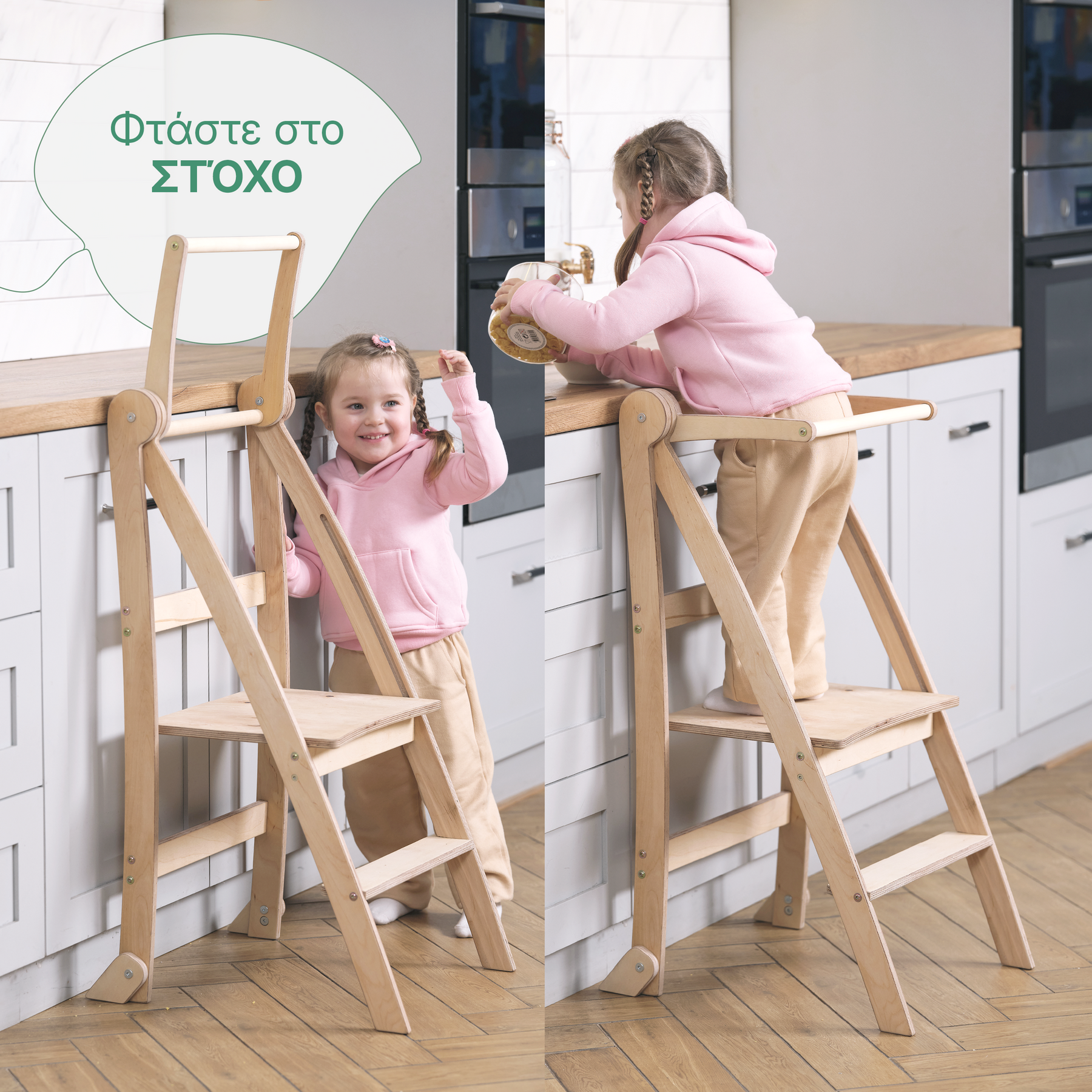 Αφήστε το μικρό σας να εξερευνήσει, να μάθει και να αναπτυχθεί με αυτοπεποίθηση! Από το ανακάτεμα και το ζύμωμα της ζύμης μέχρι το κόψιμο, το κόψιμο σε φέτες, το χύσιμο, ακόμη και το βούρτσισμα των δοντιών ή το πλύσιμο των πιάτων — οι καθημερινές δραστηριότητες γίνονται διασκεδαστικές και εκπαιδευτικές με τη βοήθεια του αναδιπλούμενου πύργου μάθησης για νήπια.