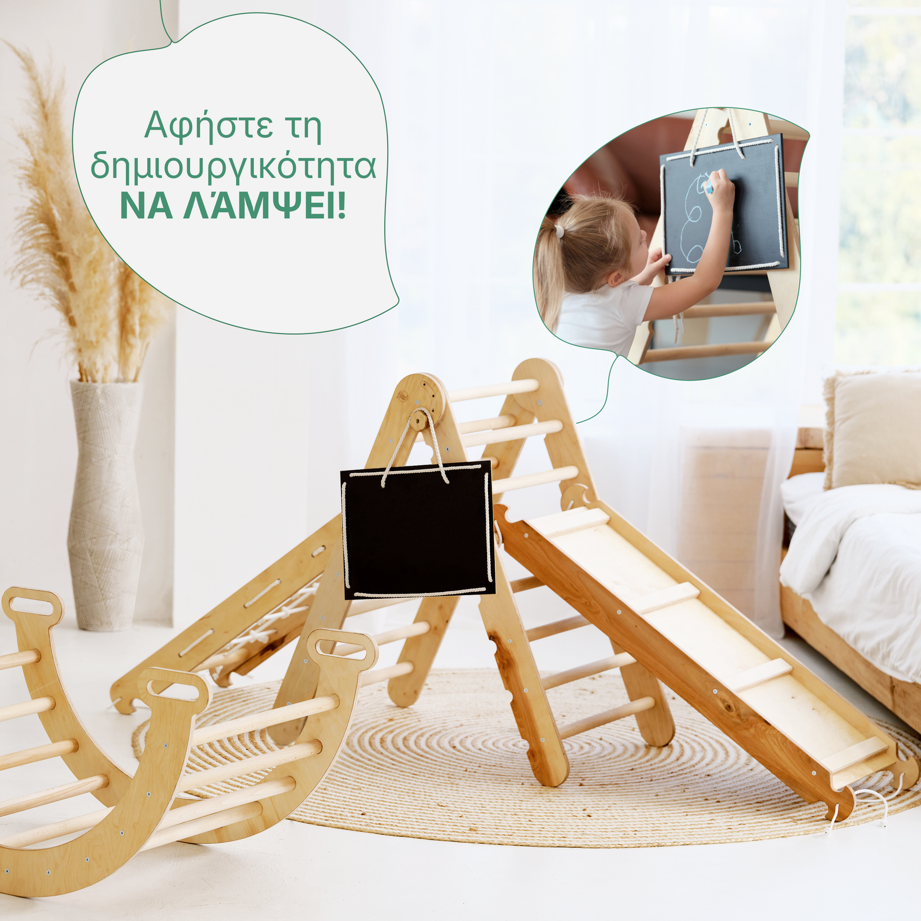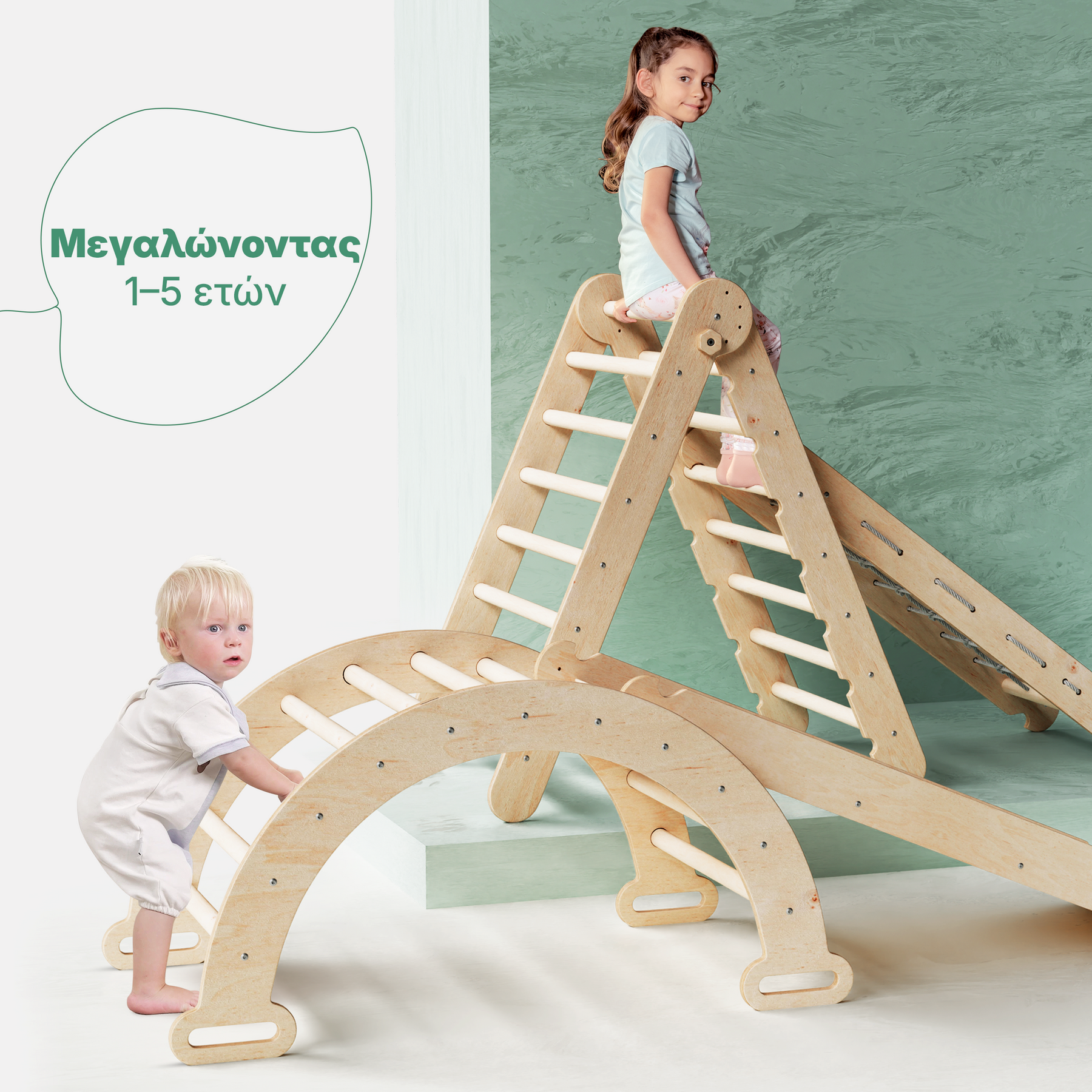 Δώστε στα παιδιά σας την ευκαιρία να αναπτύξουν την ισορροπία, τον συντονισμό και τις κινητικές τους δεξιότητες με έναν διασκεδαστικό και ελκυστικό τρόπο. Το σετ αναρρίχησης Montessori περιλαμβάνει βασικά στοιχεία: ένα κρεμαστό τόξο, σκάλα σε σχήμα τριγώνου, διπλής όψης τσουλήθρα/σκαλοπάτια και πολλά επιπλέον αξεσουάρ. Αυτό το πολυλειτουργικό σετ μετατρέπει το ενεργό παιχνίδι σε ένα ισχυρό εργαλείο ανάπτυξης.